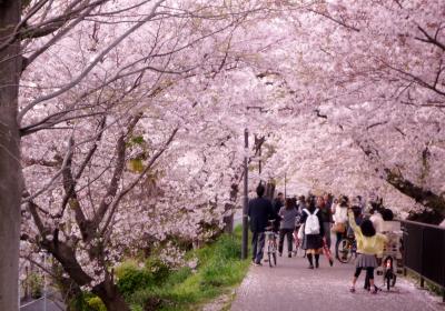 桜のトンネルの中を楽しそうに歩く人々が多いです。