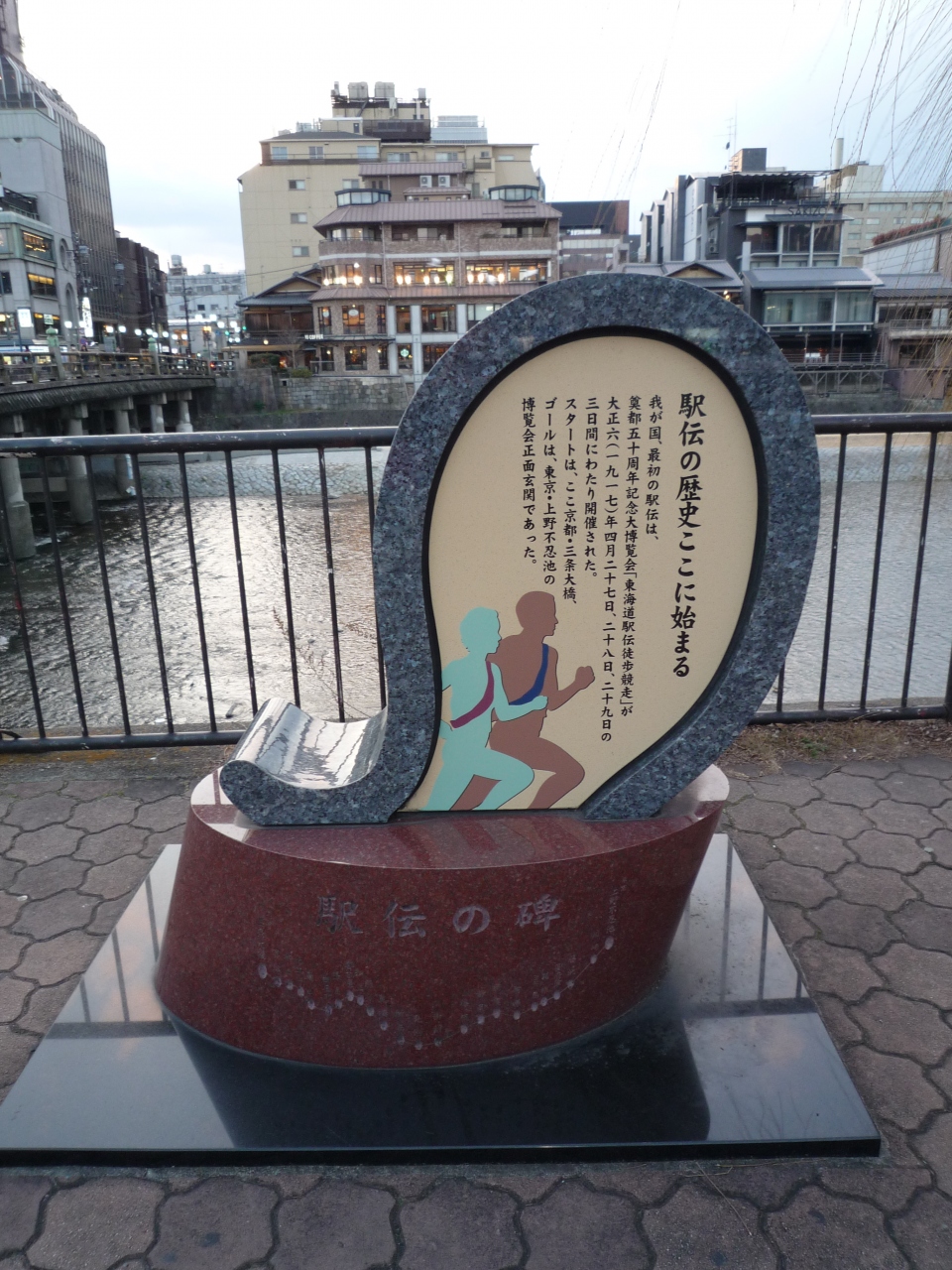 この石碑が駅伝の歴史の始まりの地となった三条大橋に造られました。