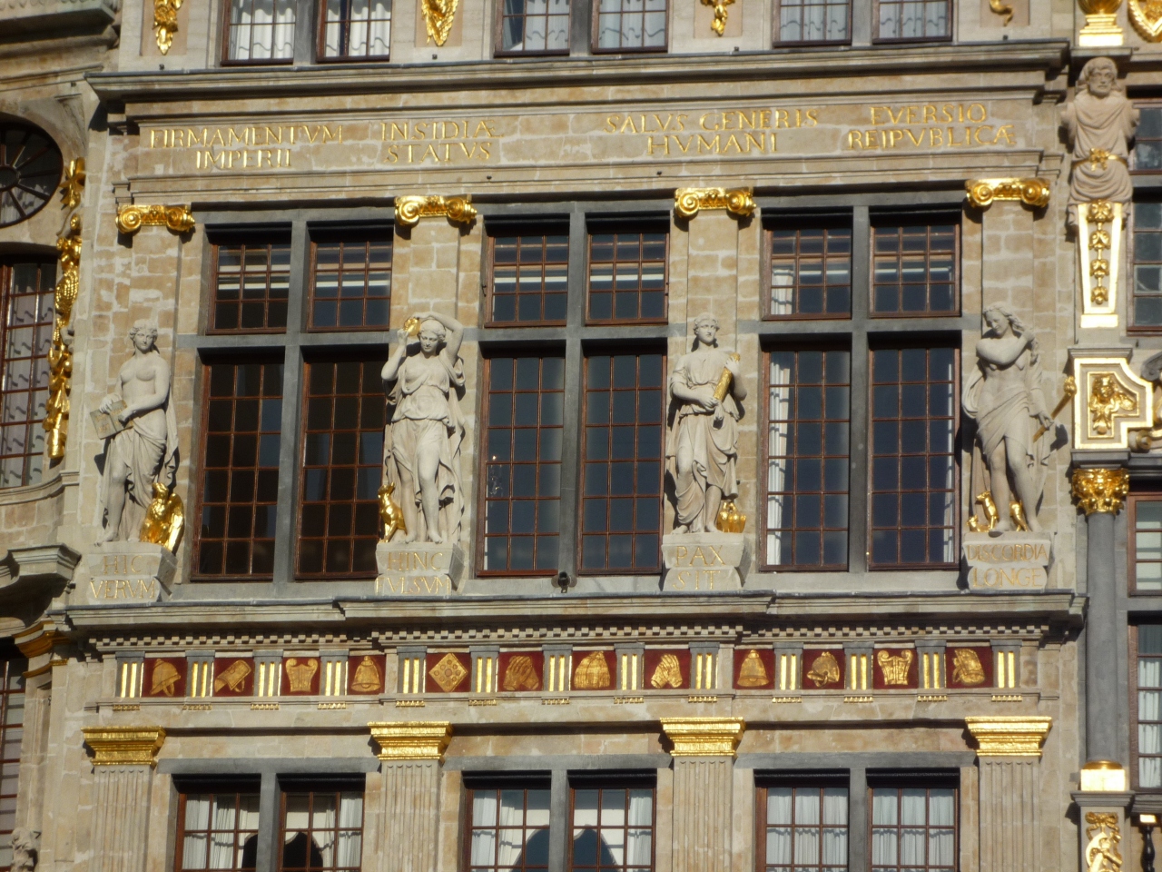 建物の壁面には当時の職業を表わす紋章や思いを込めた像などが飾られています。