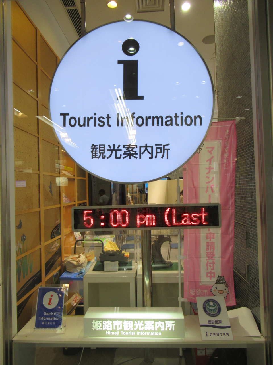 姫路市観光案内所は、JR姫路駅の中央コンコース西側の姫路城側の北の端にあり、大きな「i」(インフォメーション)マークがあるので遠くからでもすぐに分かりました。
