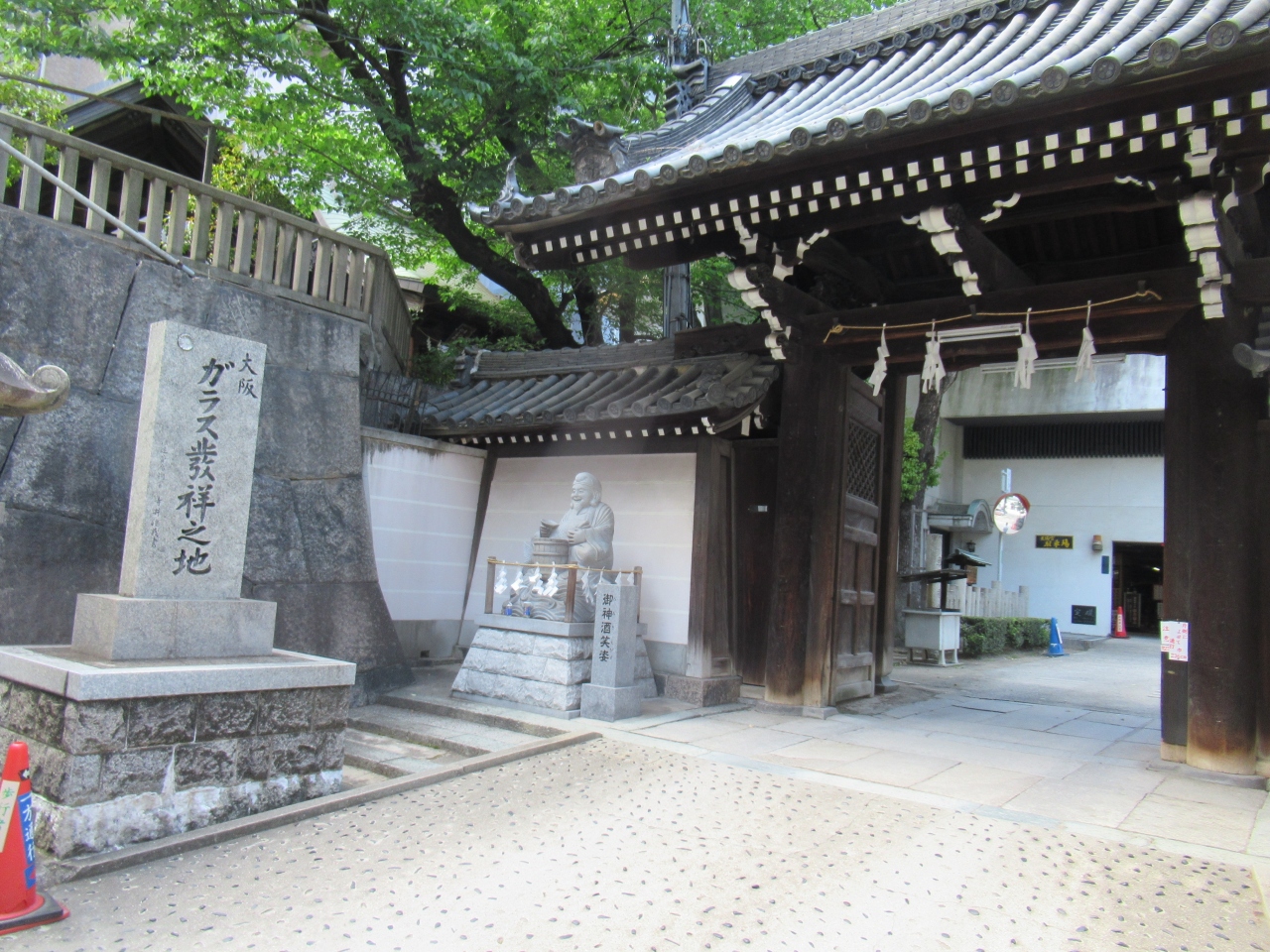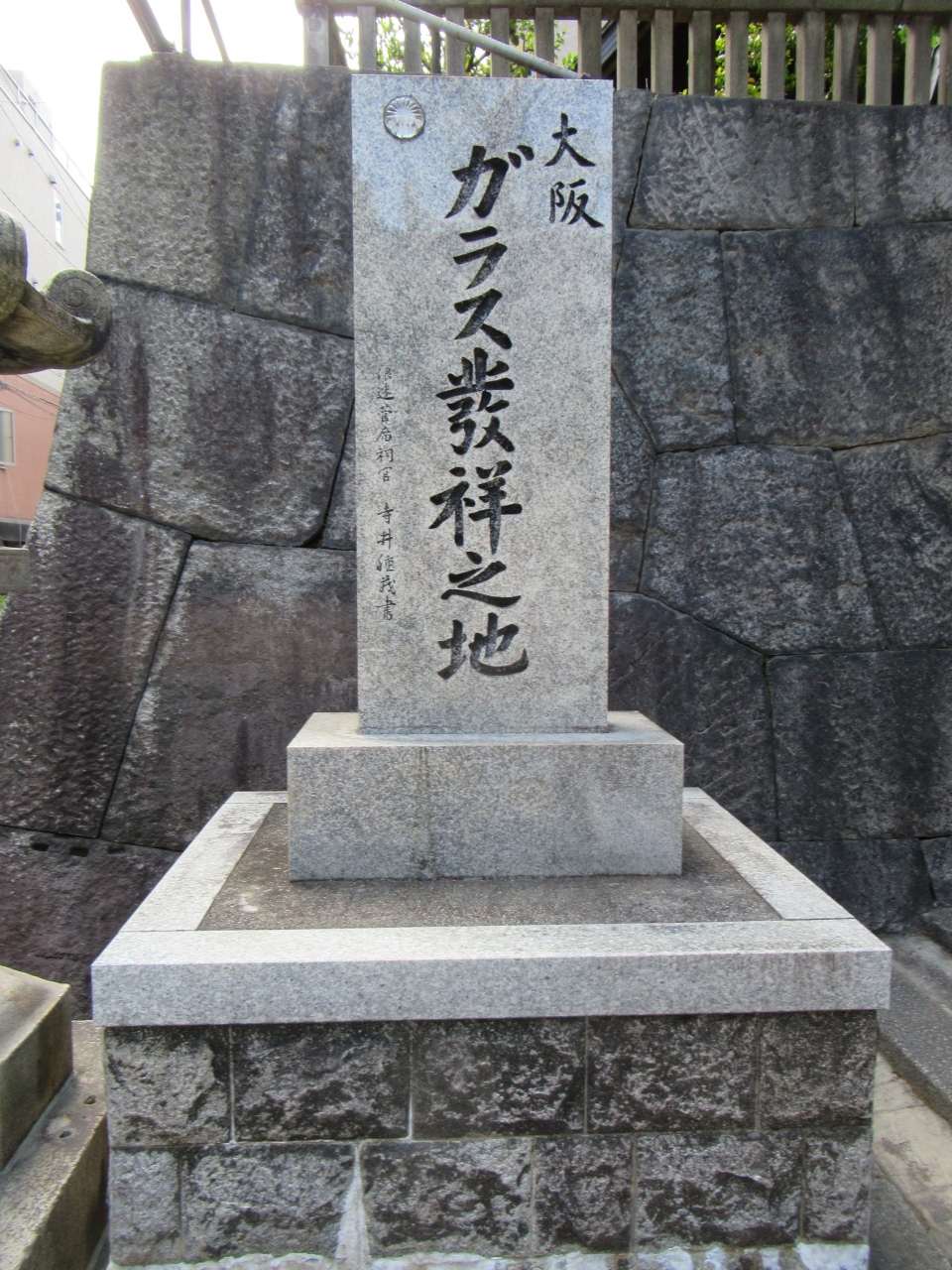 「大阪ガラス発祥之地」の碑は、大阪市北区の天神橋筋商店街の近くの大阪天満宮の正門の西側にあります。