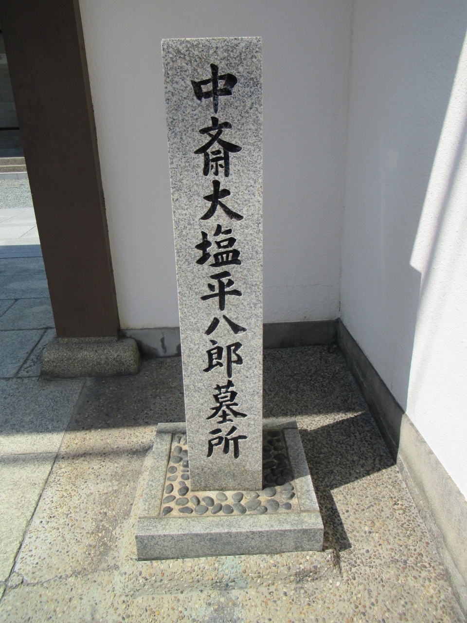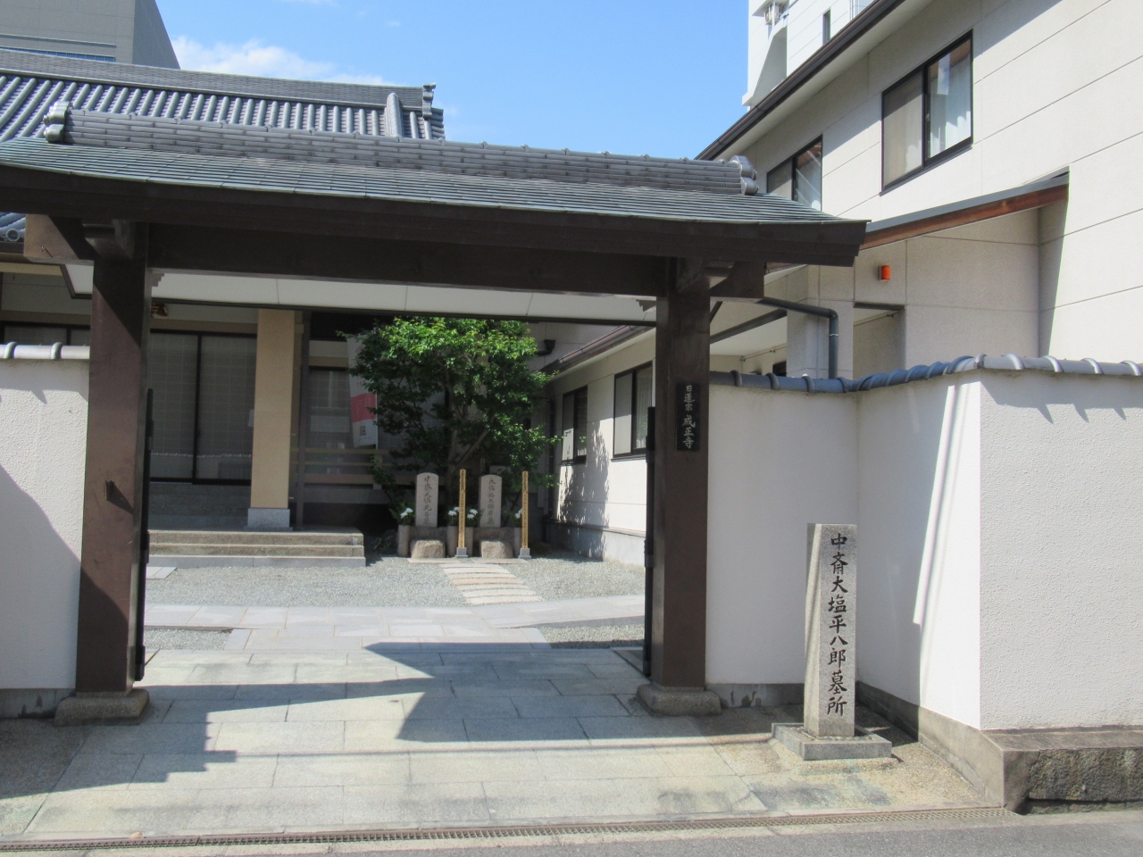 人々が絶大な尊敬の念を寄せた大塩平八郎は、大阪の堀川戎神社の東にある成正寺に眠っていて、お寺の前に墓所の石碑があります。