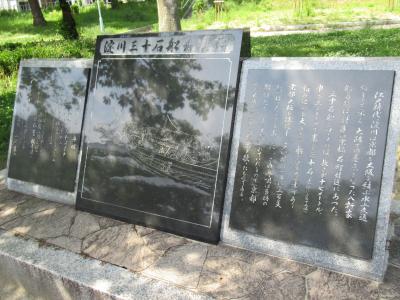 淀川三十石船舟唄歌碑は、大阪の淀川の支流である大川の北岸の天満橋から天神橋に広がる南天満公園内にあります。