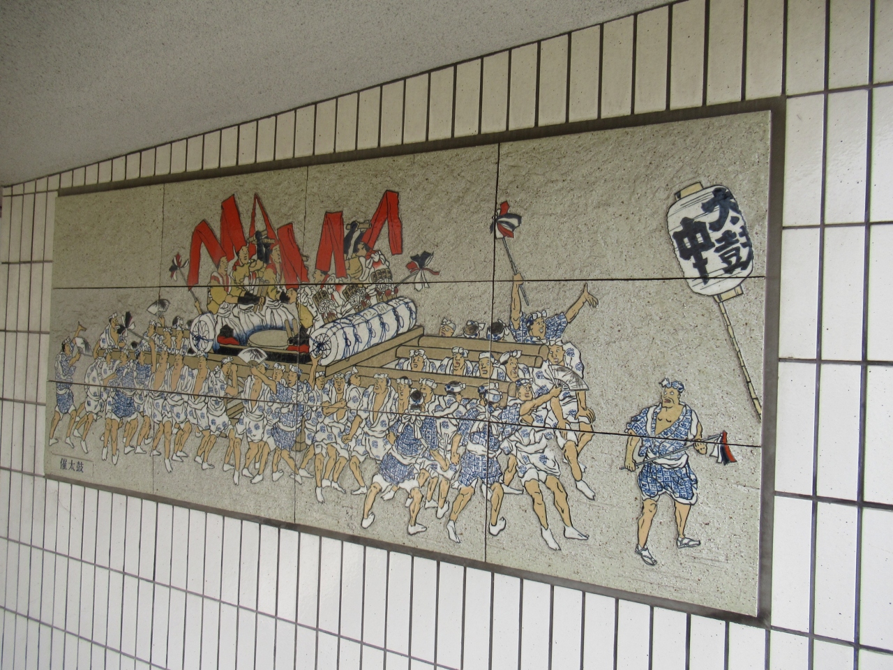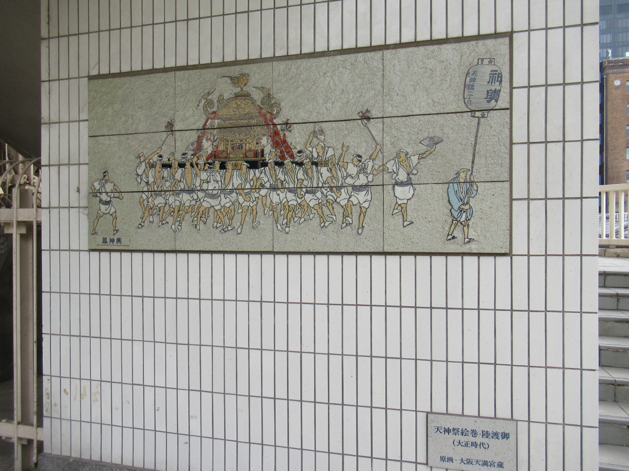 中之島公園から階段で登れるようになっていて、柱の部分に天神祭絵巻を模写した絵陶板が飾られていて、天神祭りとも関係もあるのかなと思いました。- 旅行時期