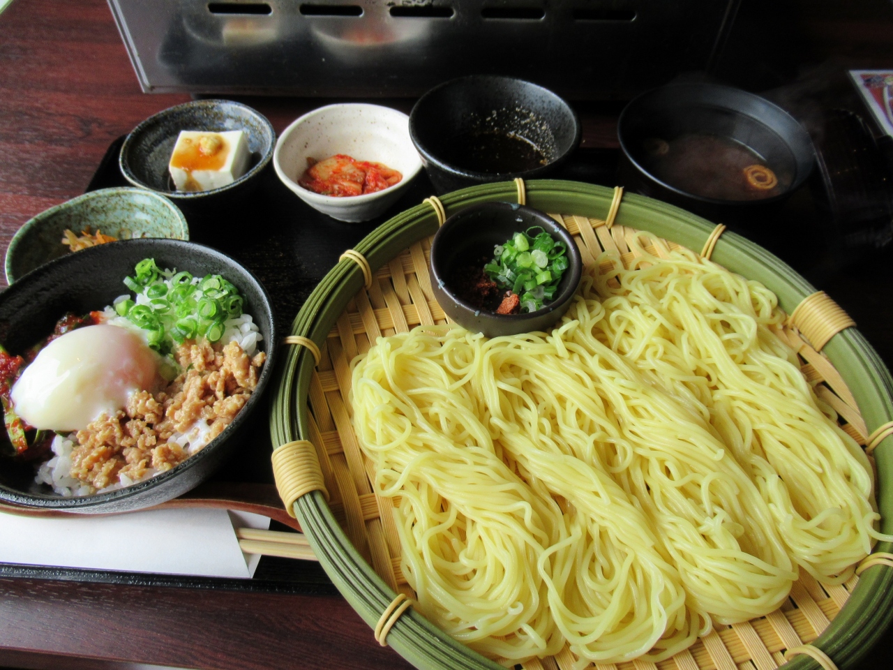 ちょっと出てくるまで時間が掛かりましたが、メニューの写真通りで、つけそば、ミニ鶏そぼろ丼と味噌汁に小鉢が3品で満足できる内容でした。- 旅行時期