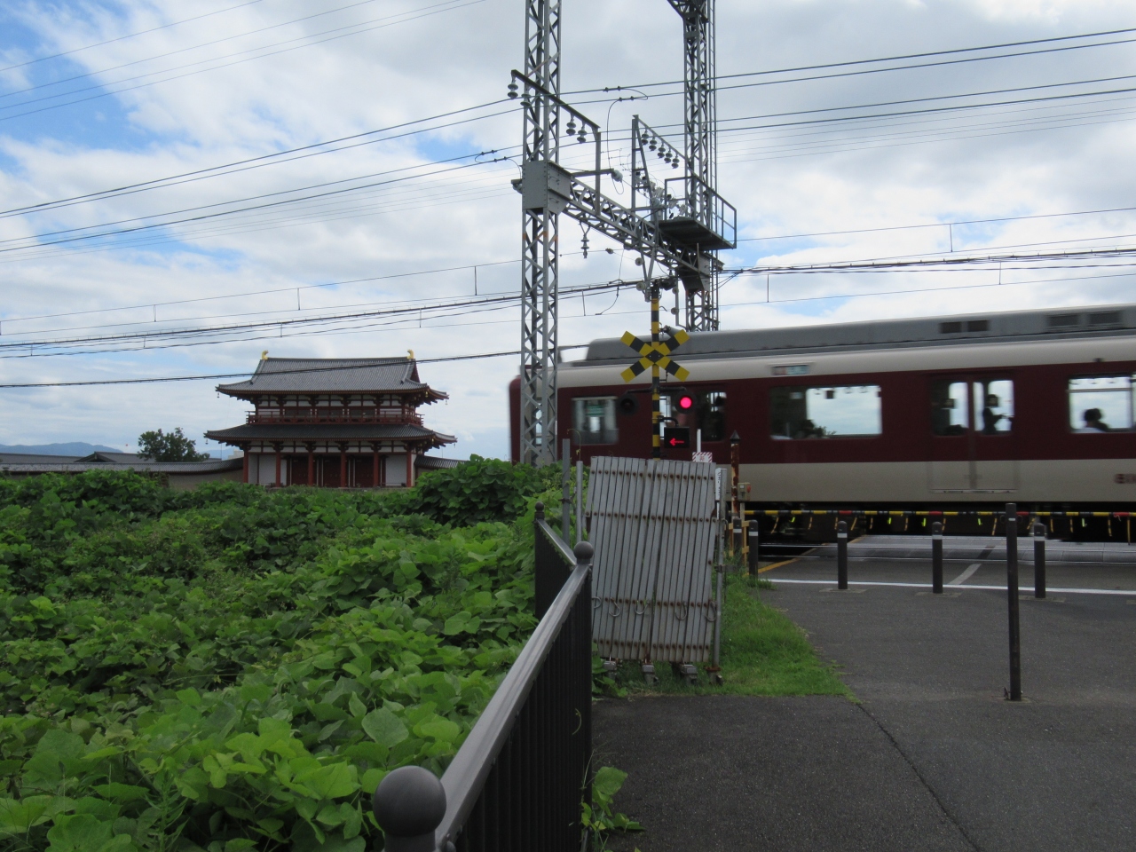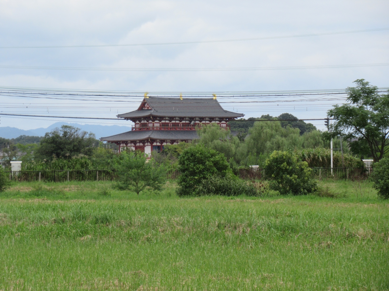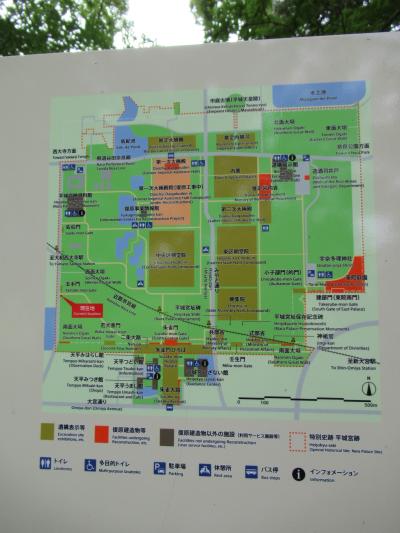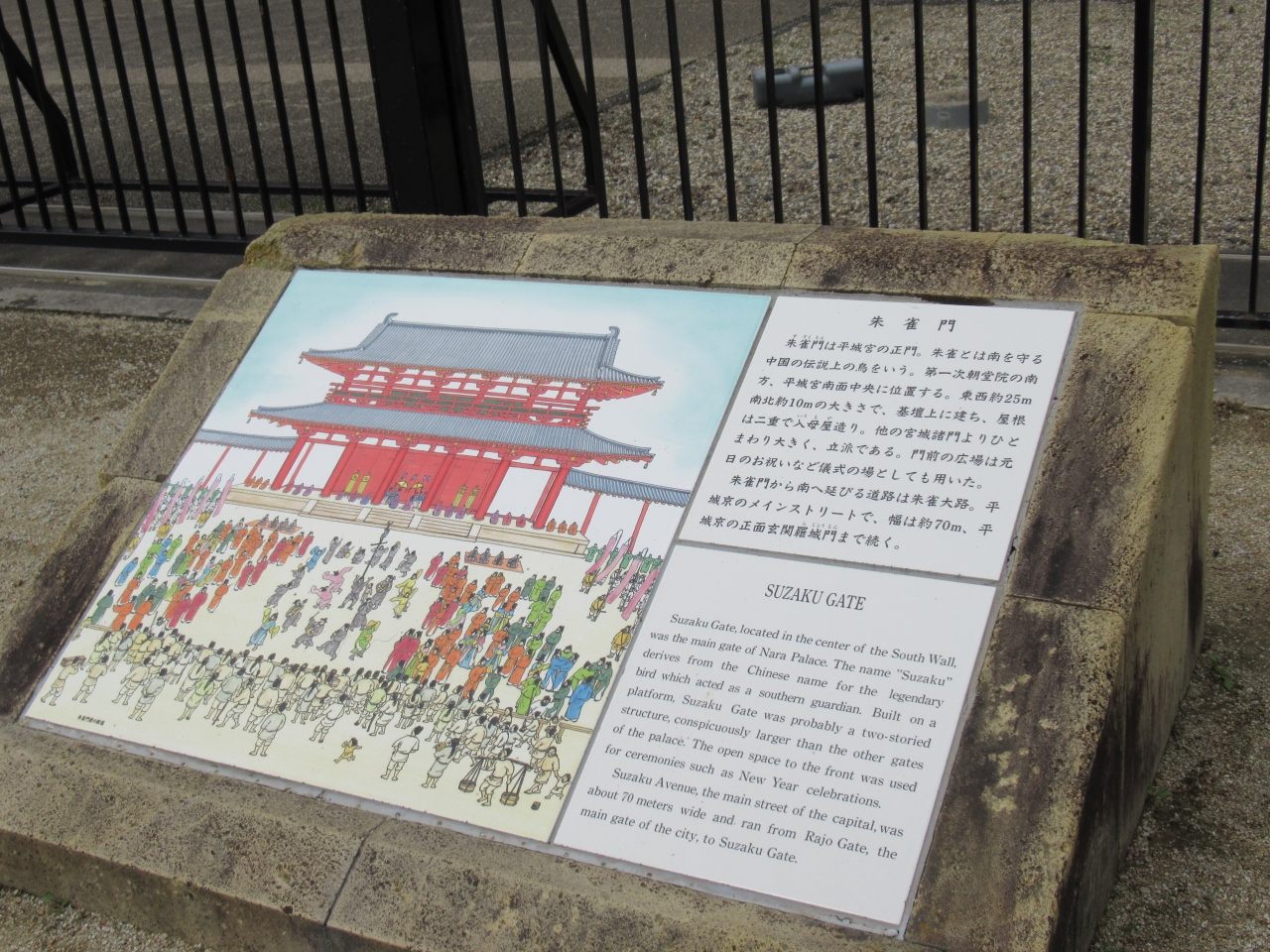 近鉄の大和西大寺駅の南口から歩いて平城京跡史跡公園まで行きました。案内が出ているのを見落として別の方向に進んでしまいましたが、戻って軌道修正すると、道路に朱雀門と第一次大極殿までの距離が100mごと位に距離が表示されていました。