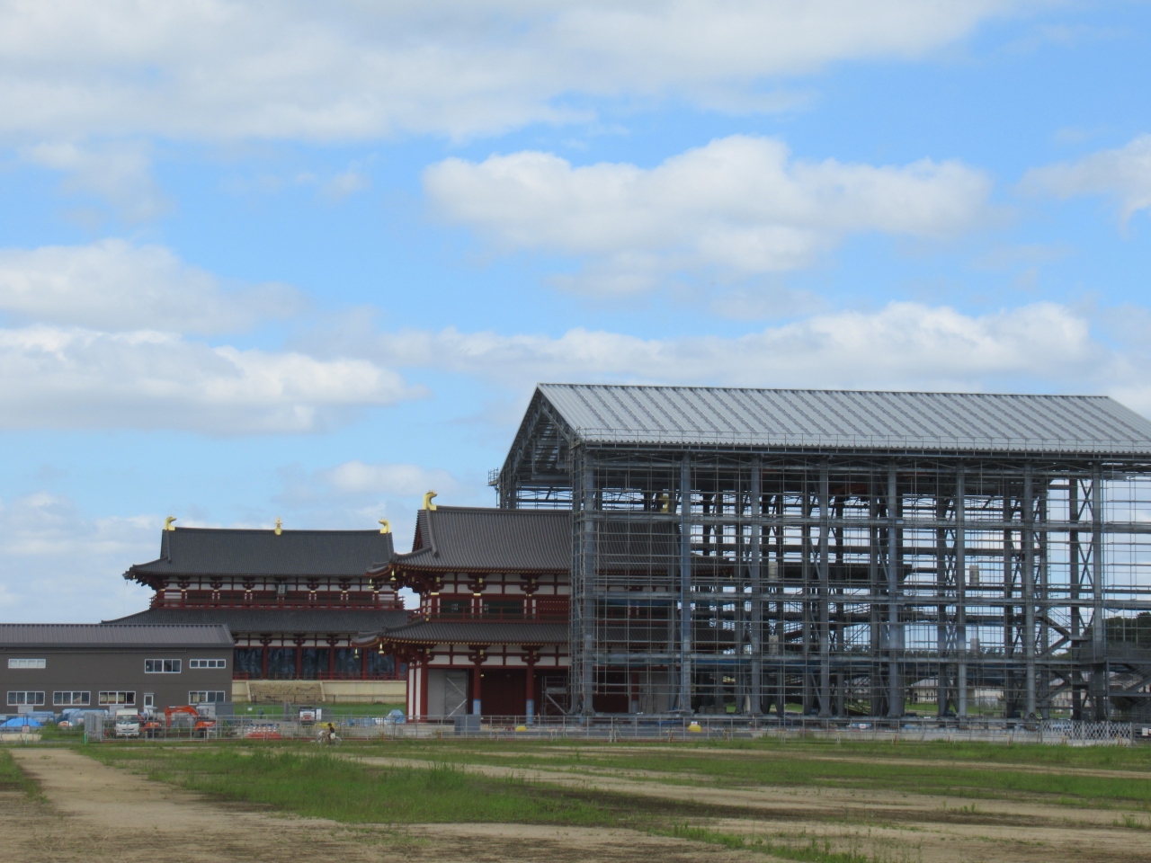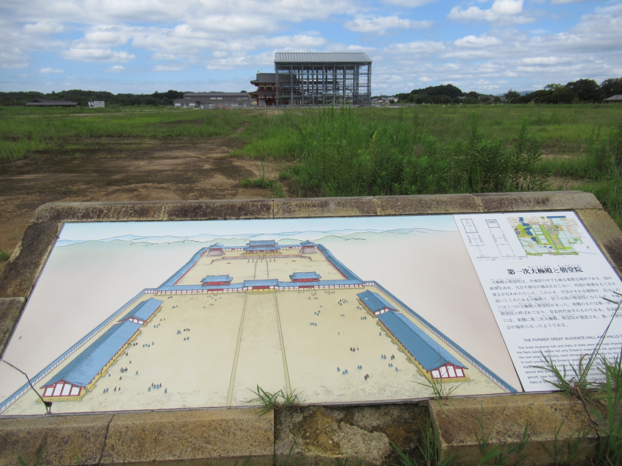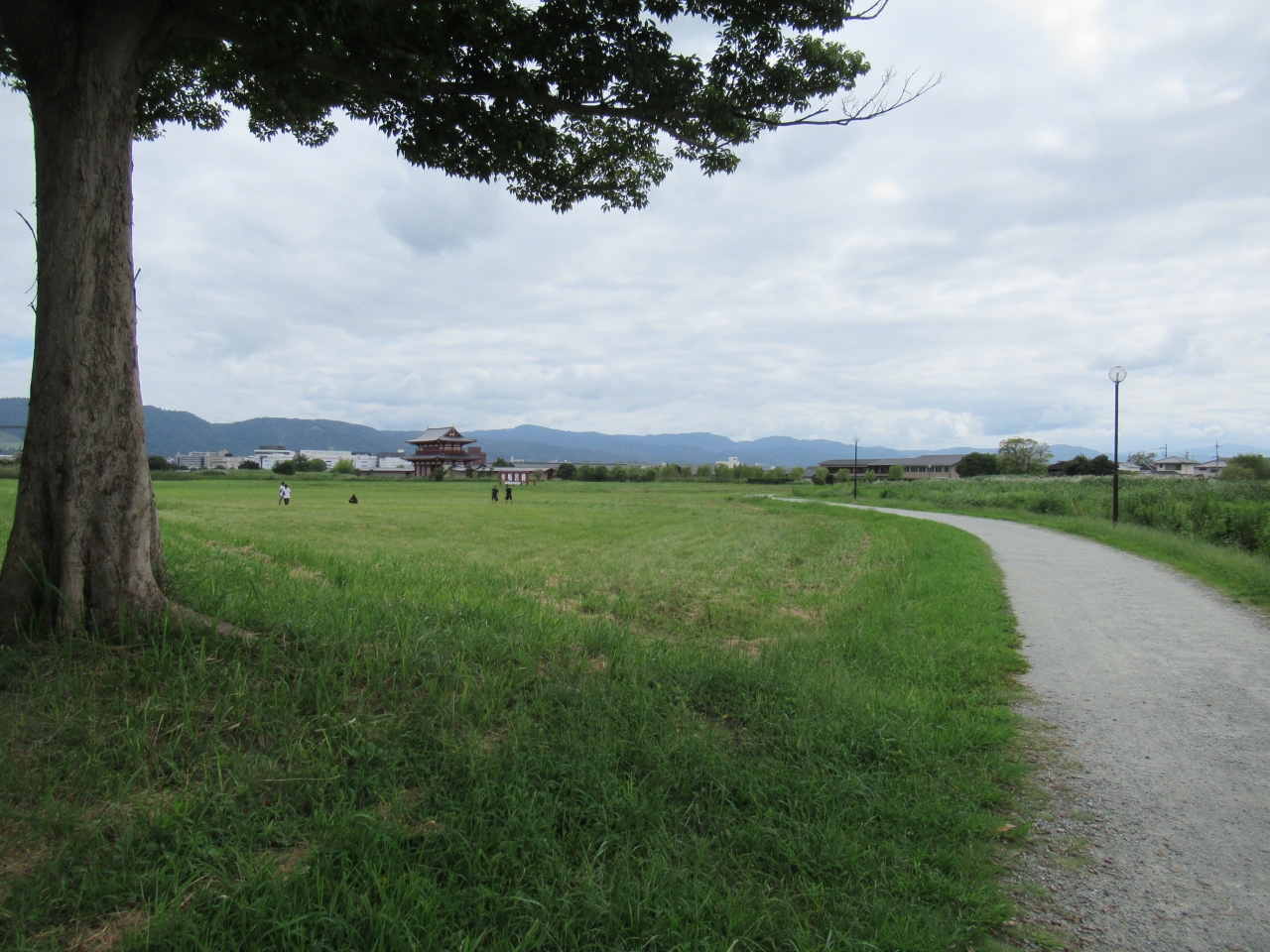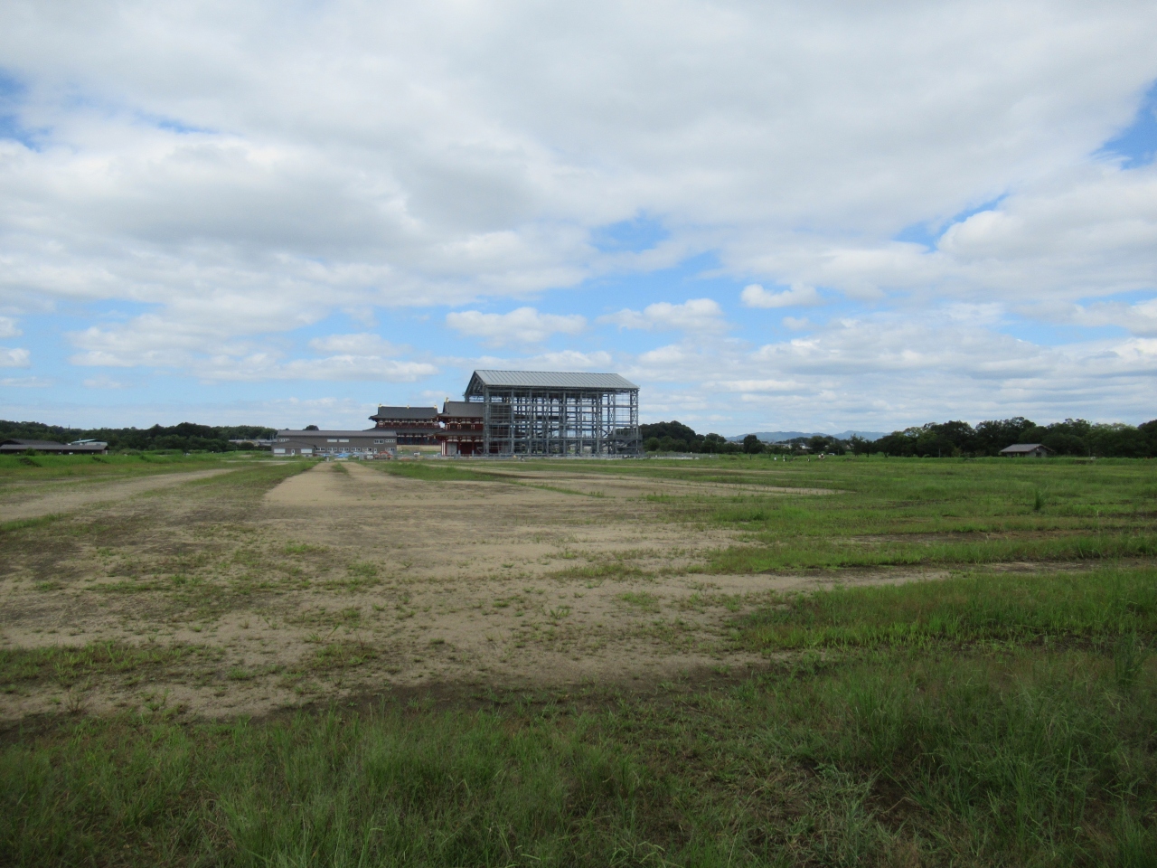 玉手門の辺りから公園の敷地に入りましたが、広大な敷地には北側の第一次大極門や復元工事中の第二次大極門、南側には朱雀門があり、それ以外はほぼ原っぱが広がっている状態です。