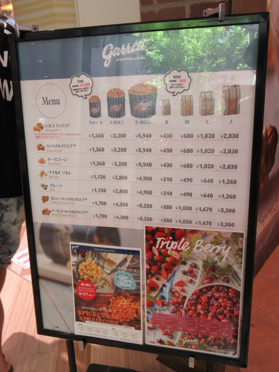 エキスポシティのオレンジサイドエントランスを入った所でたまたま見つけたのがギャレット・ポップコーン・ショップスです。広い間口で最初は何のお店か分からなかったけど、メニュー表を見てポップコーン専門店と知りました。