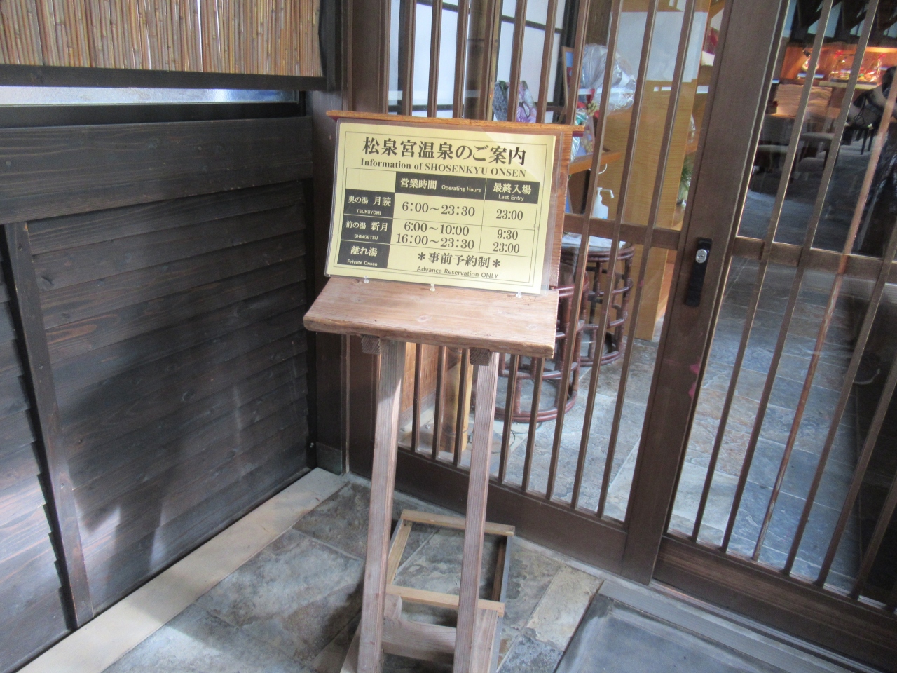 まず、温泉の受付でカードキーを見せて大小のタオルをもらいます。受付のすぐ先に「新月」の湯が、さらに100mほど離れて「月読」の湯があります。露天風呂もありますが、ホテルの客室数からするとそれほど広くはありません。