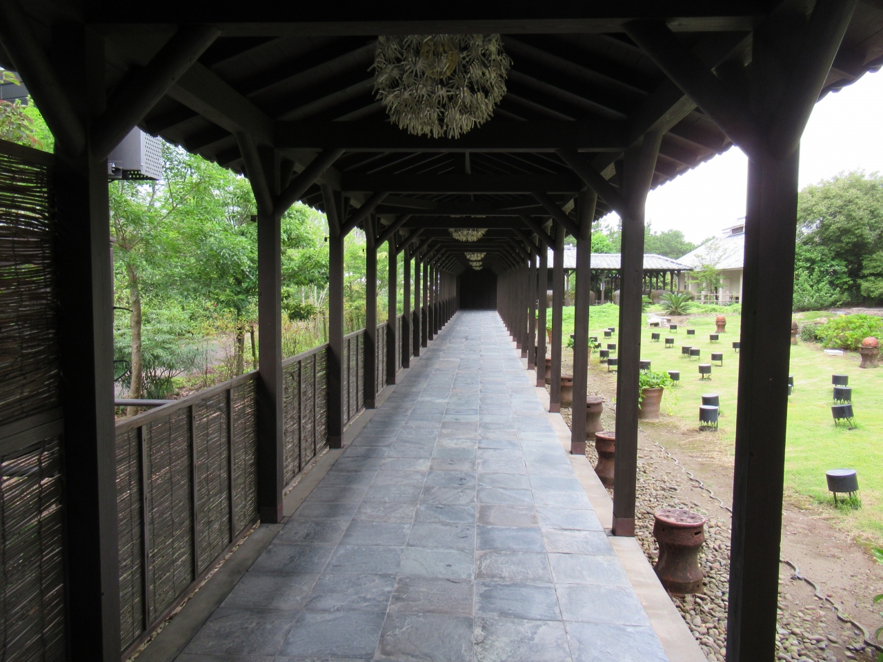 ホテルの部屋から松泉宮へ行くには、ホテル棟から出てプールをぐるりと回る和風の通路を通って行きます。