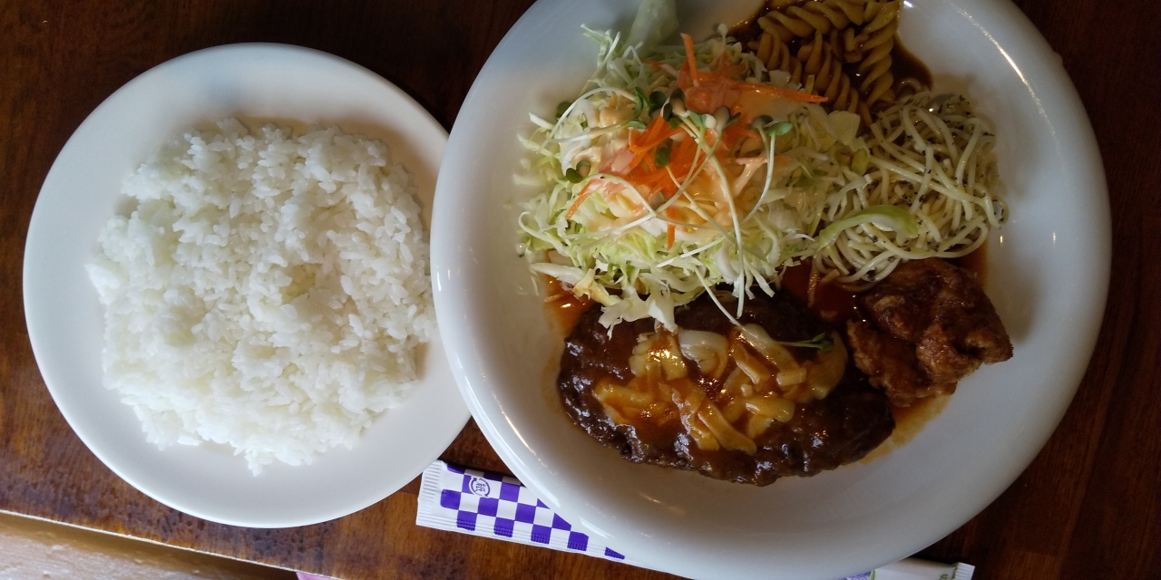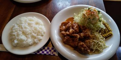 12時過ぎに入った時は混んでなくて、奥さんは煮込みハンバーグ、わたくしはから揚げの定食を注文。からあげはスパイシーで美味しかったです。