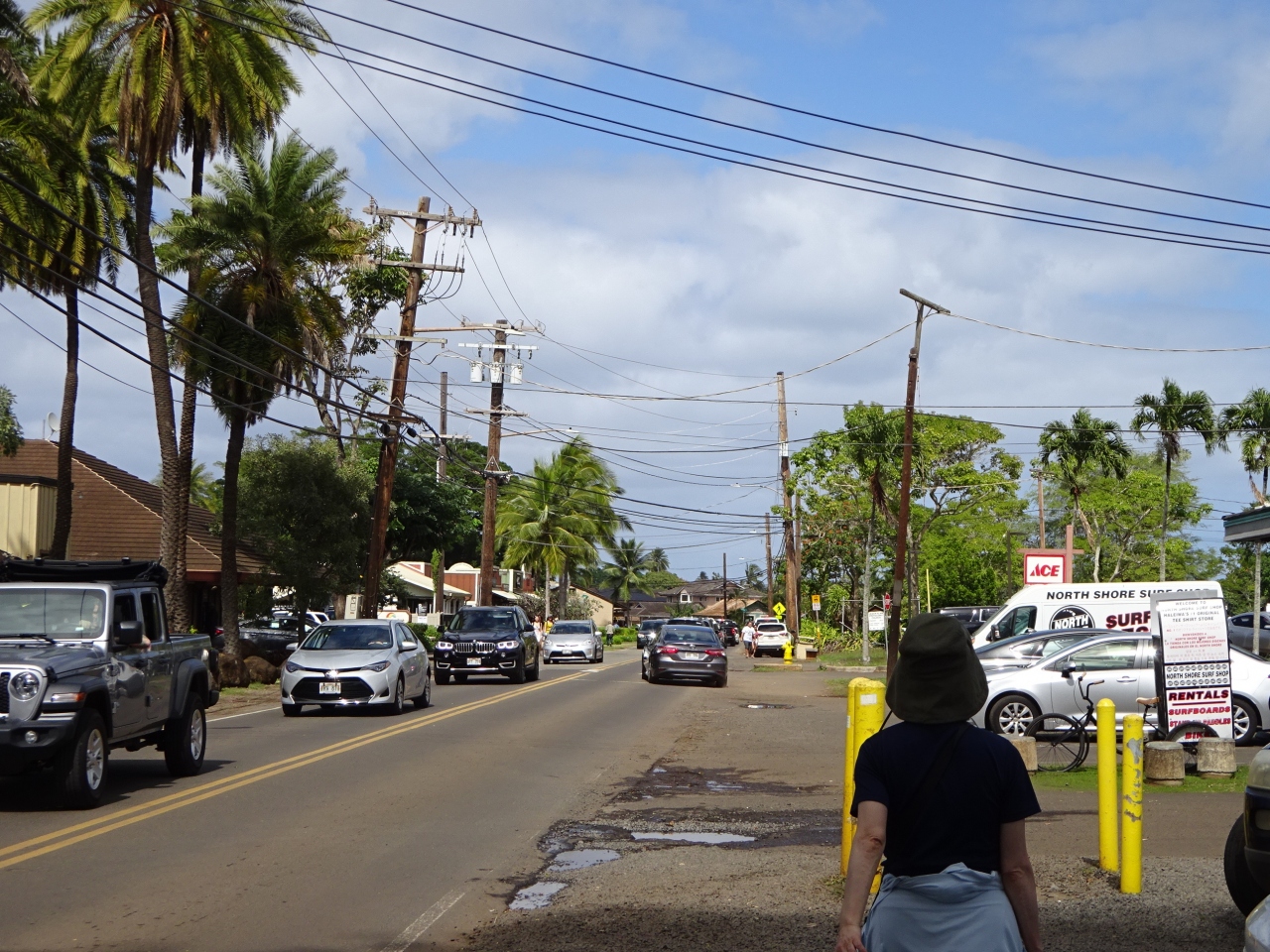 ハレイワはこじんまりとした町並みで、メインの道路が片側1車線で結構狭くて歩道も狭かったです。