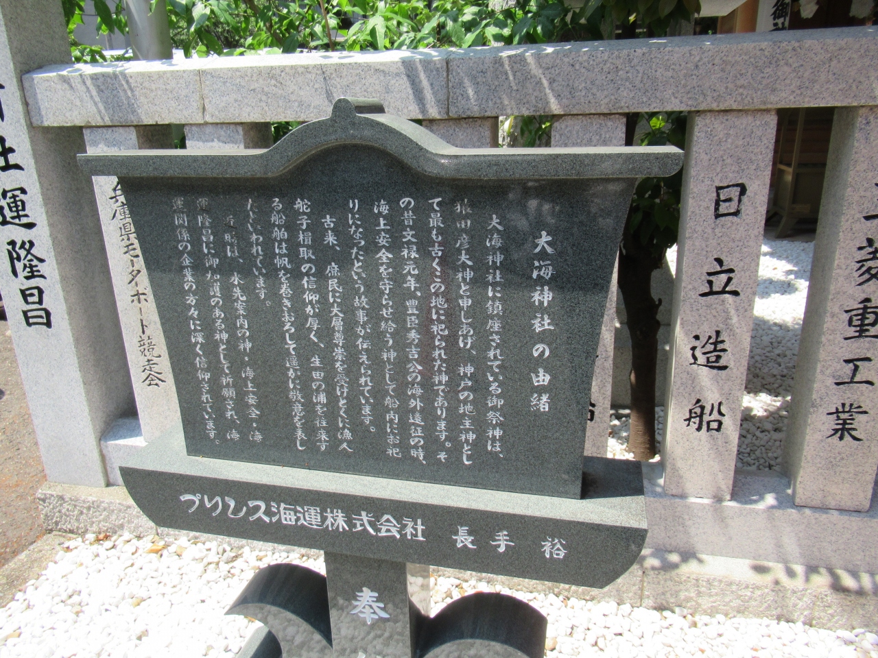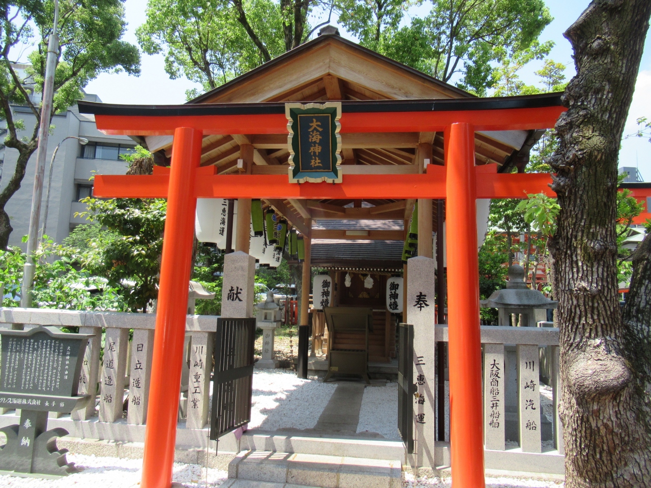 大海(だいかい)神社は、神戸の三宮にある生田神社の摂末社の一つで、二の鳥居と三の鳥居のあいだの西側の場所にあります。