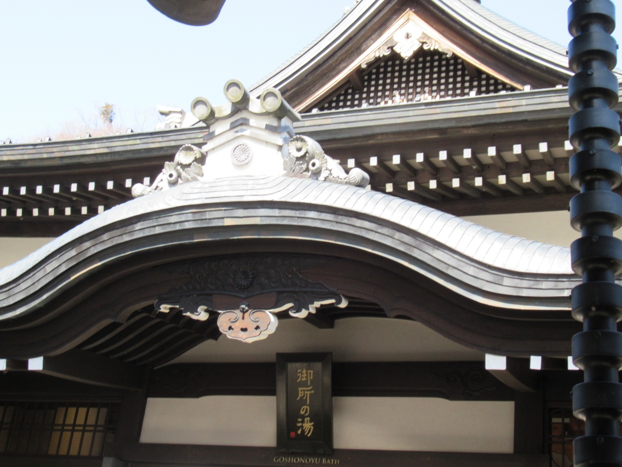 他の外湯と違って正面には門があって、長い門と建物の間に池があり、建物自体も京都御所にちなんだだけあって一番古風な感じがします。