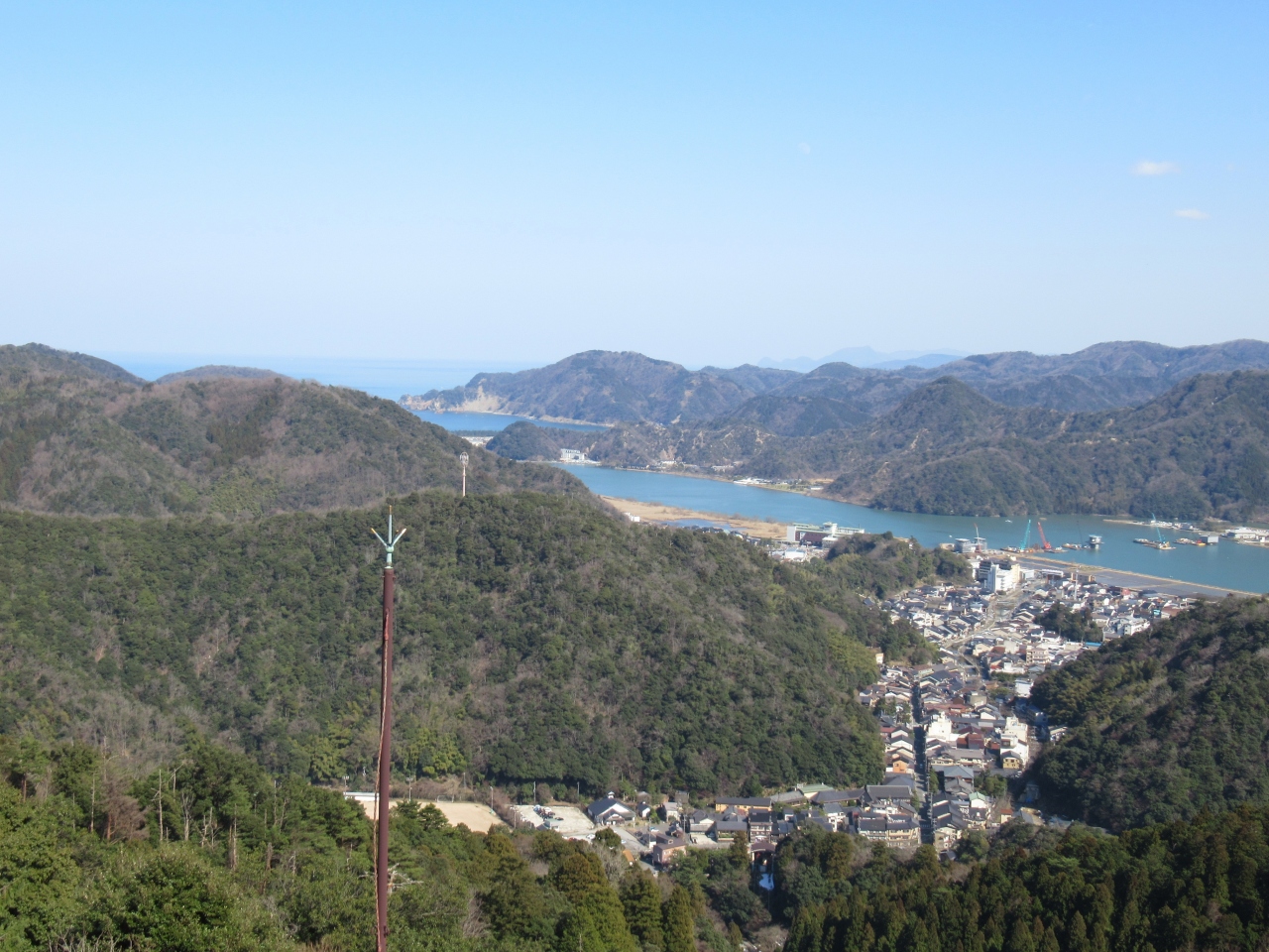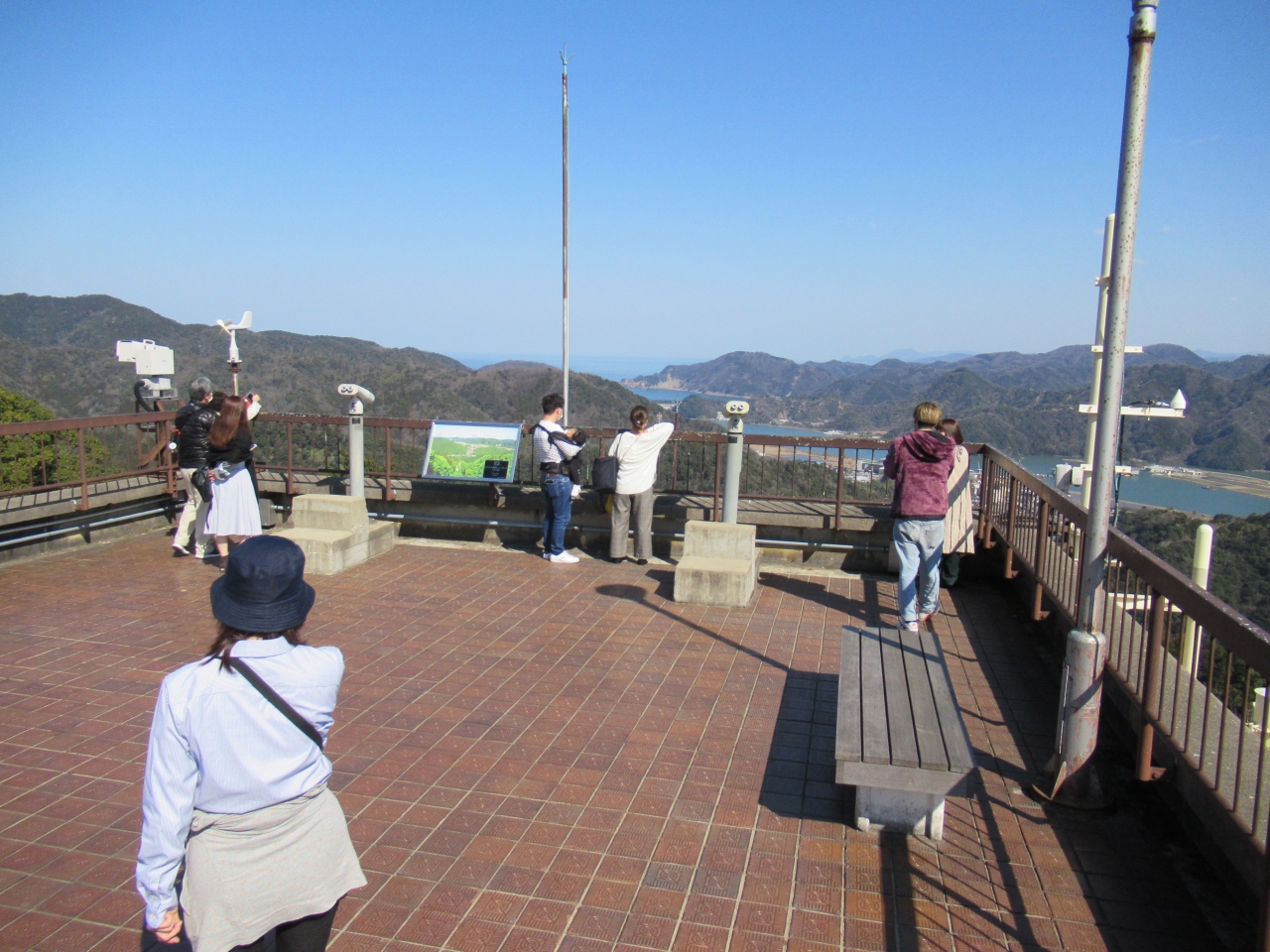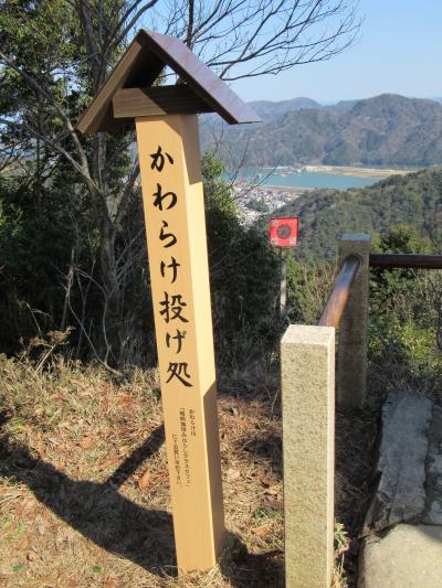 山頂の展望台からは、天候に恵まれて日本海までの絶景を見られました。それからカニ塚、慈母観音像、温泉寺の奥の院、かわらけ投げ場を回って、山頂駅の反対側にある公園で風景を眺めながら休憩しました。