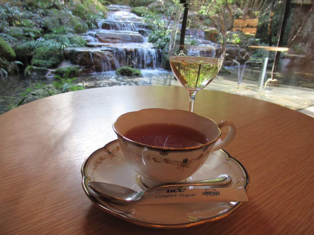 中庭には樹木や植物があって自然との調和が感じられ、テーブルや椅子もシックで、そんな中でエスプレッソを飲んでくつろぎました。