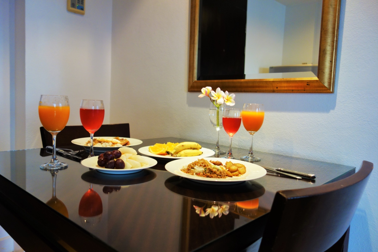スタジオが45?(THB2800/1泊)、1ベッドルームスイートが60?THB 3100/1泊)の広さでキッチンも備わっていて食器やカトラリー類、キッチン用品も