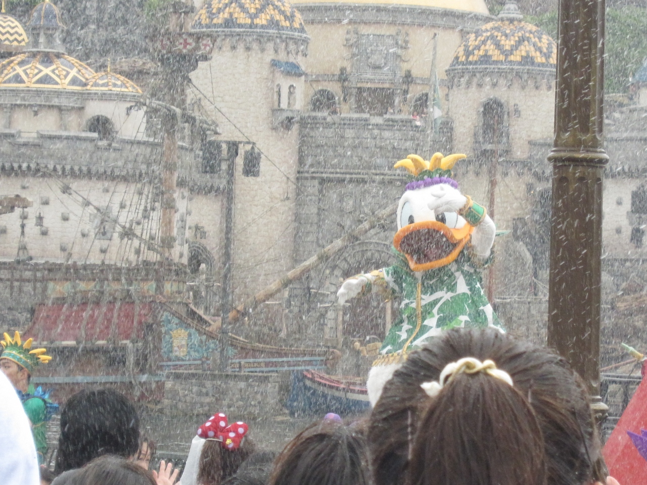 シーも母親と行ってきました。前日はランドでとても蒸し暑い日だったのですが、シーに行った日はあまり天候に恵まれず、小雨の中の観賞でした。びしょ濡れ注意とアナウンスのあるメディテレーニアンハーバーに一部入り込んでいる観賞エリアで見ていました。