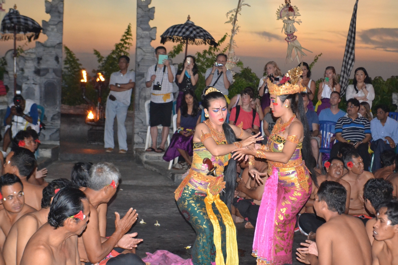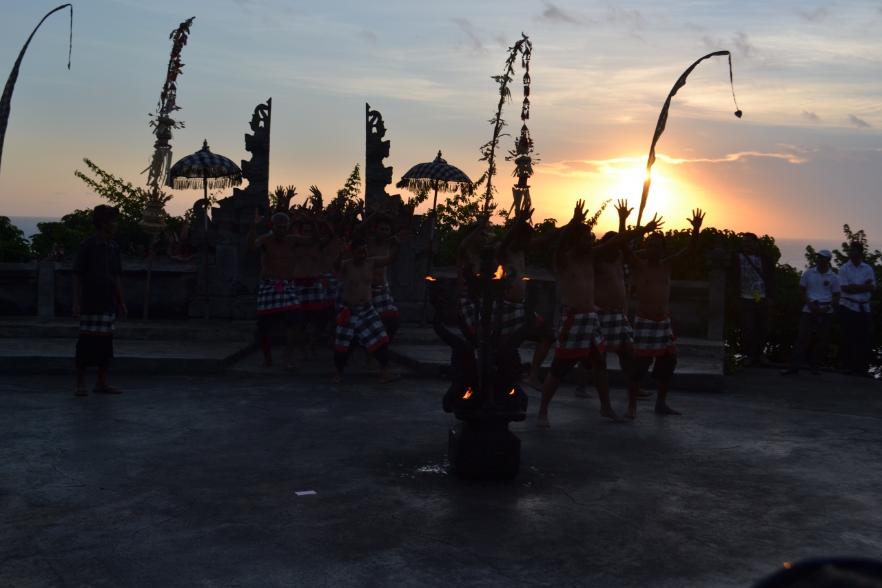 大勢の村人たちによるダンスを見るために、急いでいたためにウルワツ寺院は通り過ぎただけとなってしまいました。会場へは5時50分ごろに到着。座席はどんどんと上から詰めているので、最前列かと思いきや、後から来た人が前にまだまだ座り、それでも一杯になったら遅れて来た人は夕日側に椅子を置かれていました。そこになってしまうと全く綺麗な夕焼けを眺められないので30分前には到着した方が良さそうと思いました。