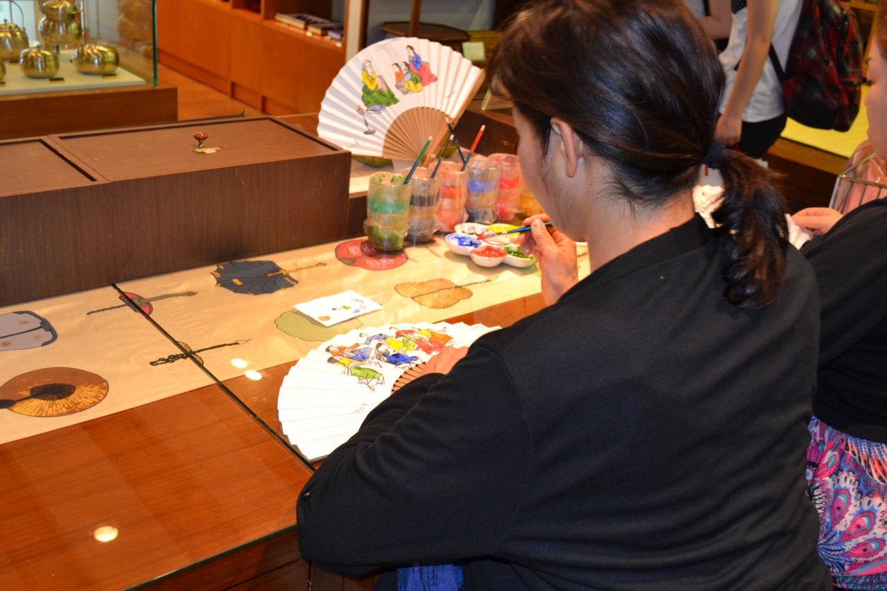 2013年7月の催しは扇子に色付けする、お面に色を付ける。その二つでした。下絵はあるのですが、せっかくの立派な扇子なので、実用に使える丈夫な扇子を綺麗な色に塗りたい方はぜひ30分は時間をとった方がいいと思います。薄くぬるのがコツです。
