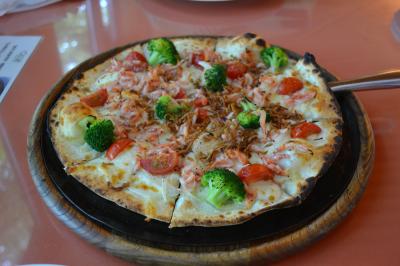 おすすめの鉄板ピザは1700円、桜エビの味を引き立たせるためにトマトソースとかはないタイプでした。と、いうわけでちょっと…。海鮮サラダはエビ、カニ、ほたて、あさり沢山入っていて味付けもよくとても美味しかったです。駐車場広いです。