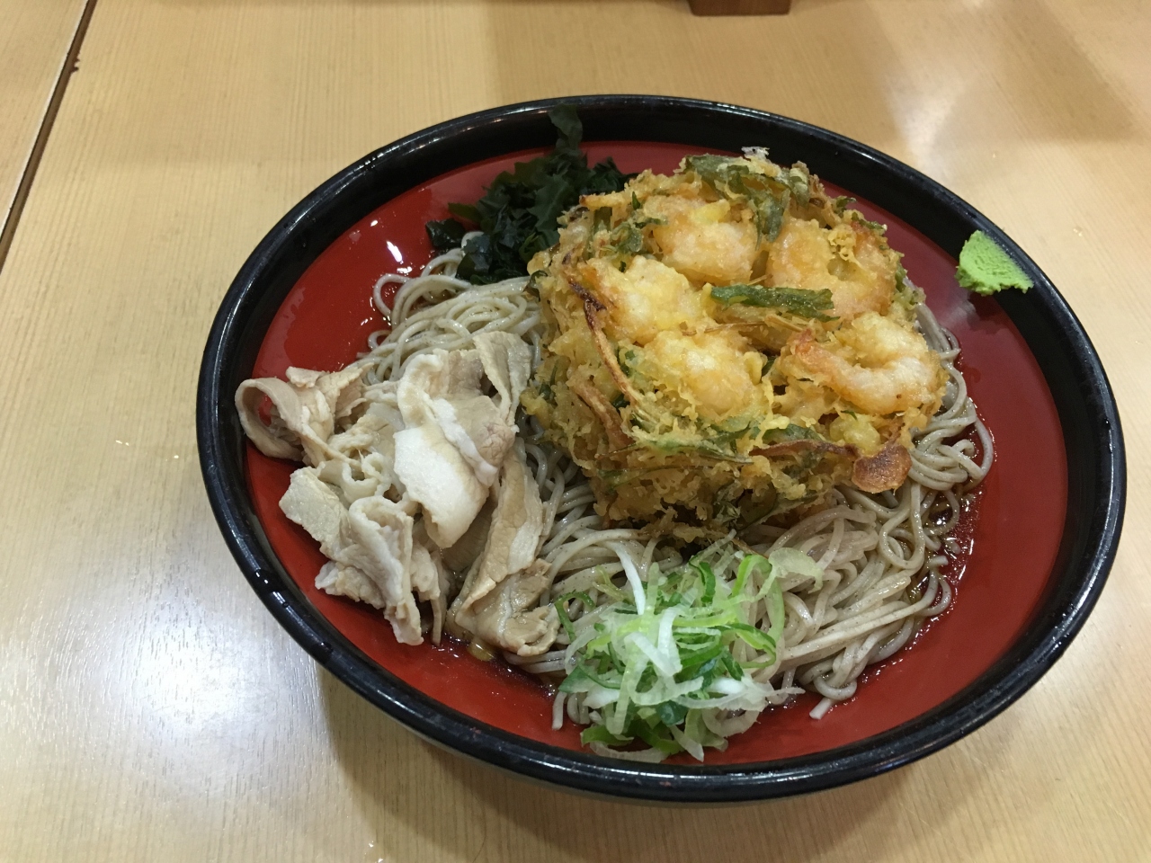 この日は、冷かけそばの2倍盛りにかき揚げと肉のトッピングでした。