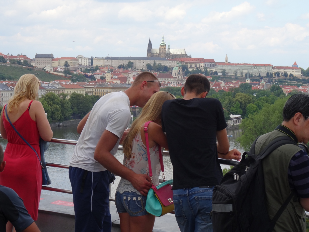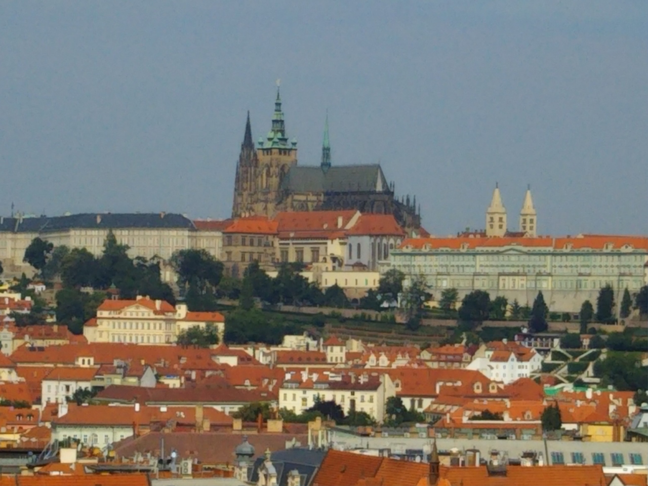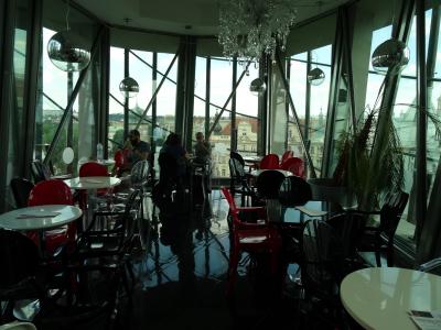 女性ビルの最上階はバーラウンジになっている。そして、隣の男性ビルの屋上につながっている。ワイン、ビールなどを片手にプラハ城、ヴルタヴァ川、オレンジの屋根が眩しい旧市街の街並みなどの絶景をのんびりと楽しむことできる。プラハ一の眺望かも。(笑)