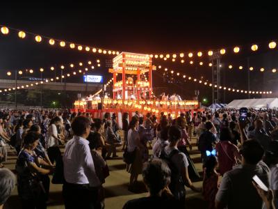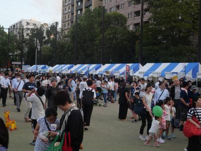グランド中央に2階建ての特設大やぐらが立ち、それを中心に踊り手の輪が何重にも取り囲む姿は壮観です。また、公園内には「大江戸縁日コーナー」や「区内名物市コーナー」や各町会によるもつ煮などのたくさんの屋台もそれを取り囲む。