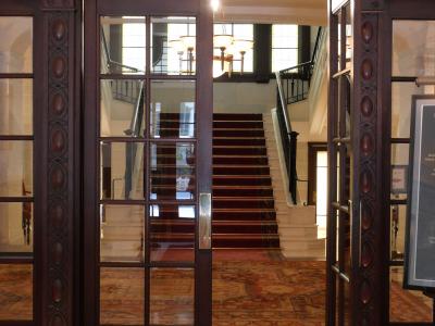 日本工業倶楽部会館は、1920年に竣工したが老朽化に伴い、現代的な三菱UFJ信託銀行本店ビルと2003年に一体化されましたが、建て替え工事にあたっては、往年の姿を極力残す工夫が施され、地上30階建ての三菱UFJ信託銀行本店ビルは、会館のやや後方に建てられ、一見、別の建物のように見える。撮影が行われた会議室は2階の大会堂とか。