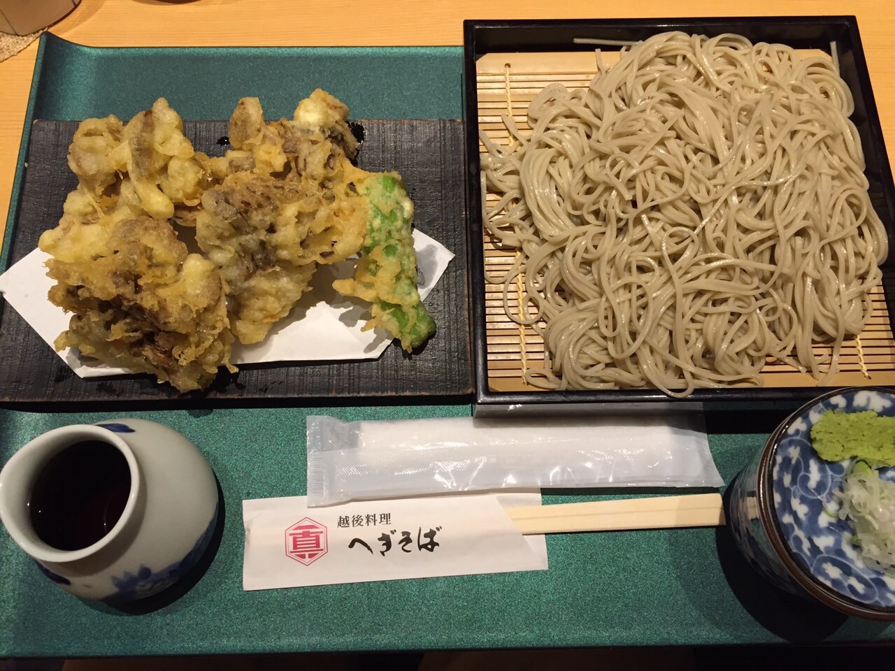 ランチにいただきました。へぎそばって、綺麗折って並べられているイメージがあったのですが、ココのはザルそば的な盛り付け。