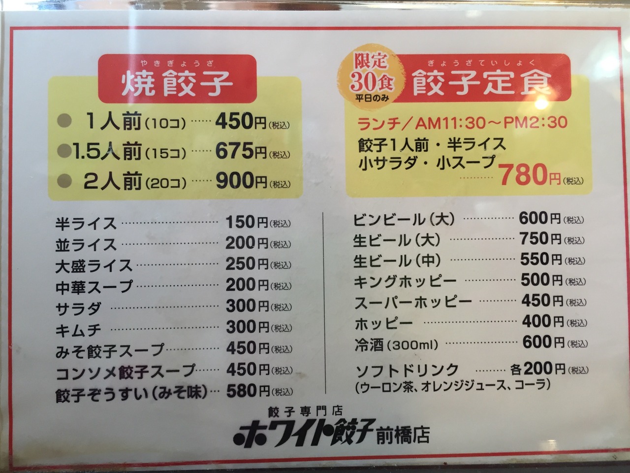 野田に本店がある、まん丸餃子です。本店は餃子と漬け物オンリーですが、前橋店には焼餃子の他に、餃子スープ、サラダ、餃子定食などがあり種類が豊富です。焼き方も前橋の方があっさりしていて、私はこちらの方が好きです。