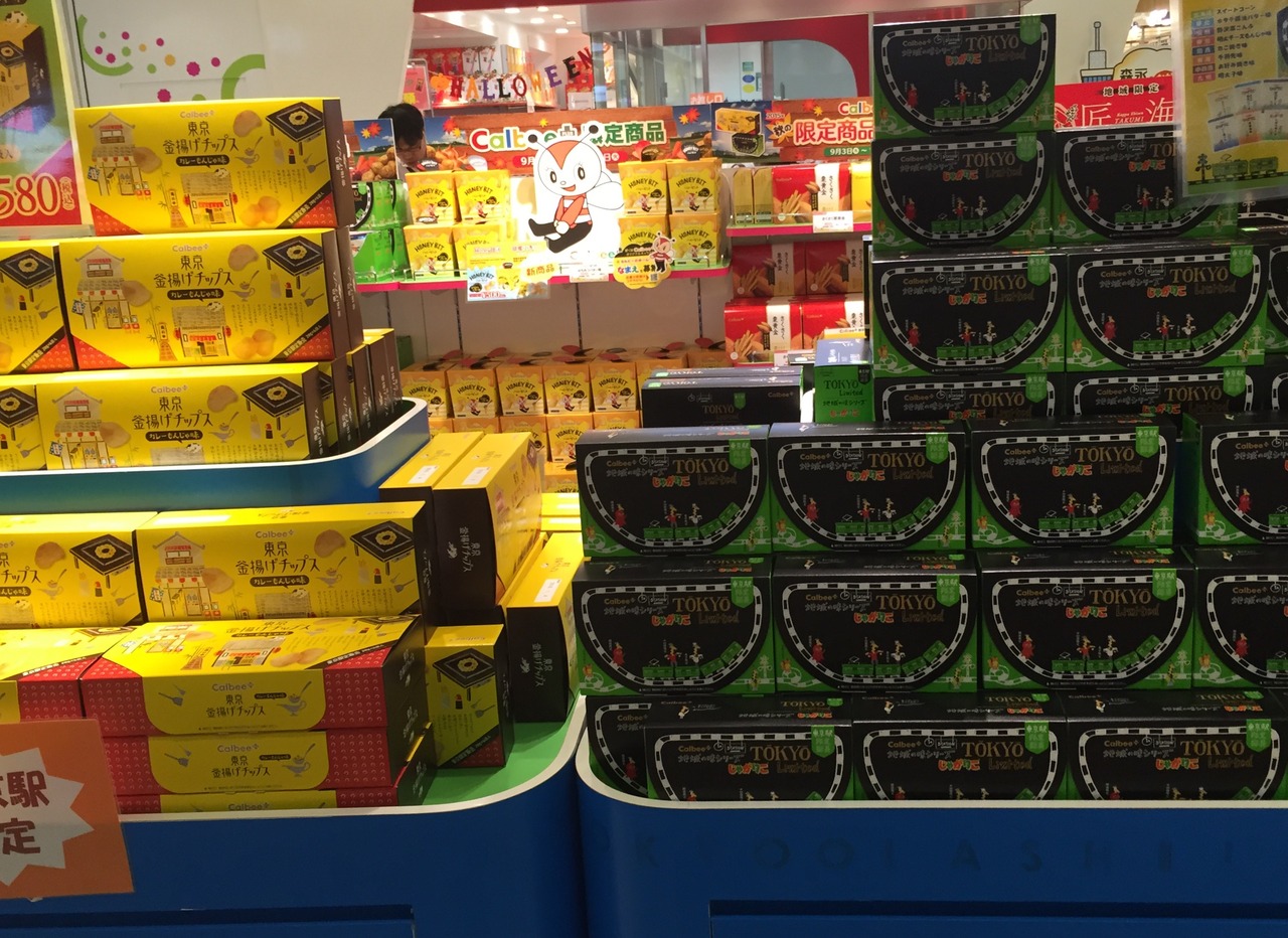 大箱のいろいろなポテトチップスが積み重ねられています。全国のご当地じゃがりこや蜂蜜味のスナック、野菜チップス、東京駅限定の釜揚げチップスなどなど。チップスバリバリ食べながら、寝転んで映画でも観たいけど、カロリーが怖いのでほどほどにします。