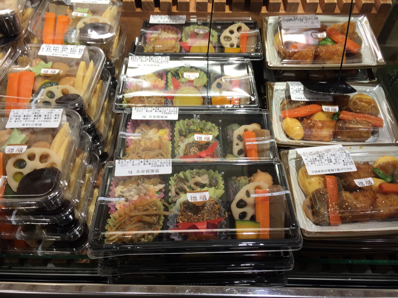 お弁当もいろいろありますが、お惣菜を時々利用します。ゴハンだけセットしておけば済むので助かります。こちらは和風料理のお店で、自分ではなかなか手間のかかる、たくさんの種類の野菜の炊き合わせなどが食べられ、身体もホッとするような感じがします。