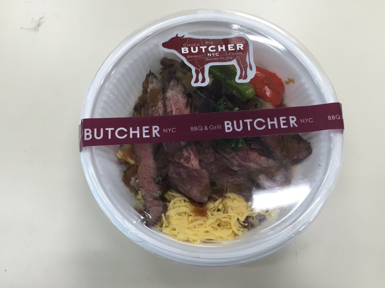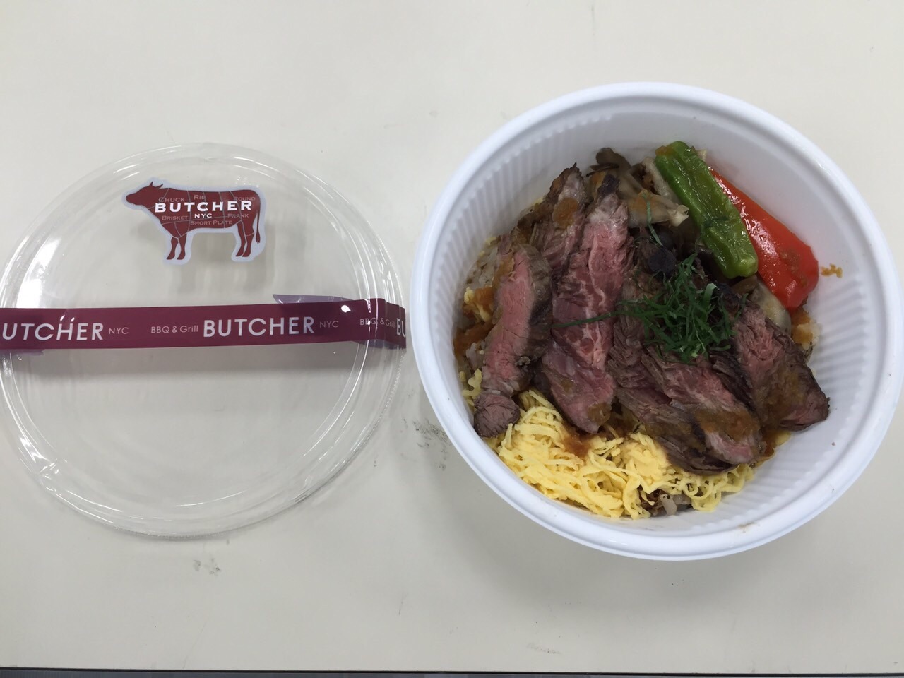 お~、これが話題の熟成肉ですか。ということで、今日のロケ弁はブッチャーNYCのお弁当。シーズンテラスから近いところだったので、まだ熱い。まわりはカリッと焼かれ、中はしっかりレア。脂がほとんどない赤身。ありがたく、美味しくいただきました。