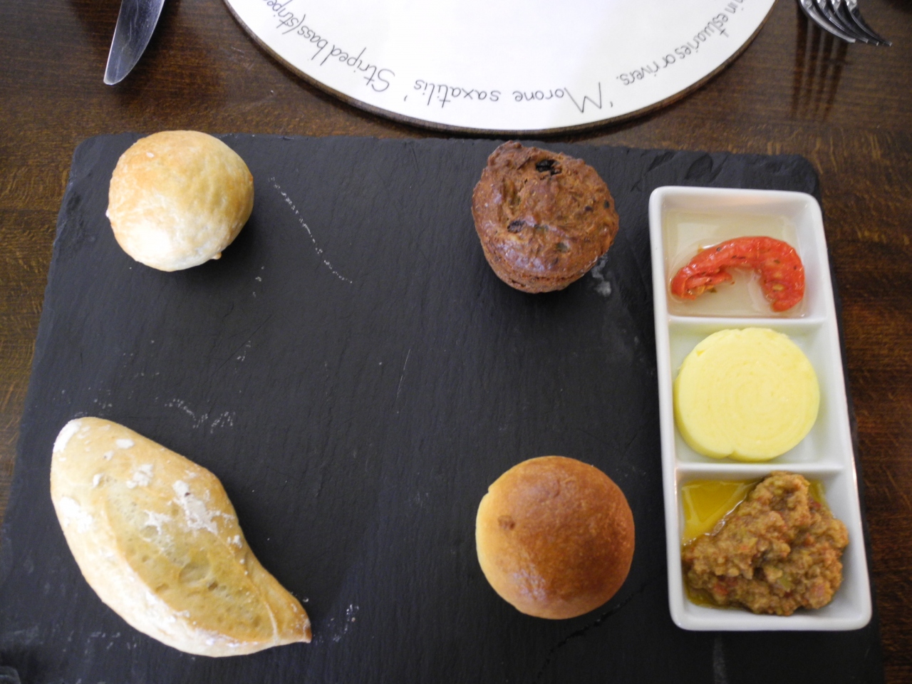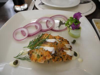 いただいたのはサーモンのハンバーグ風の前菜、白身魚のグリル、デザートなどなど。
