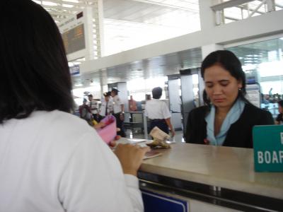 国内線の搭乗手続き中 この後隣のデスクで空港使用料をペソで払います