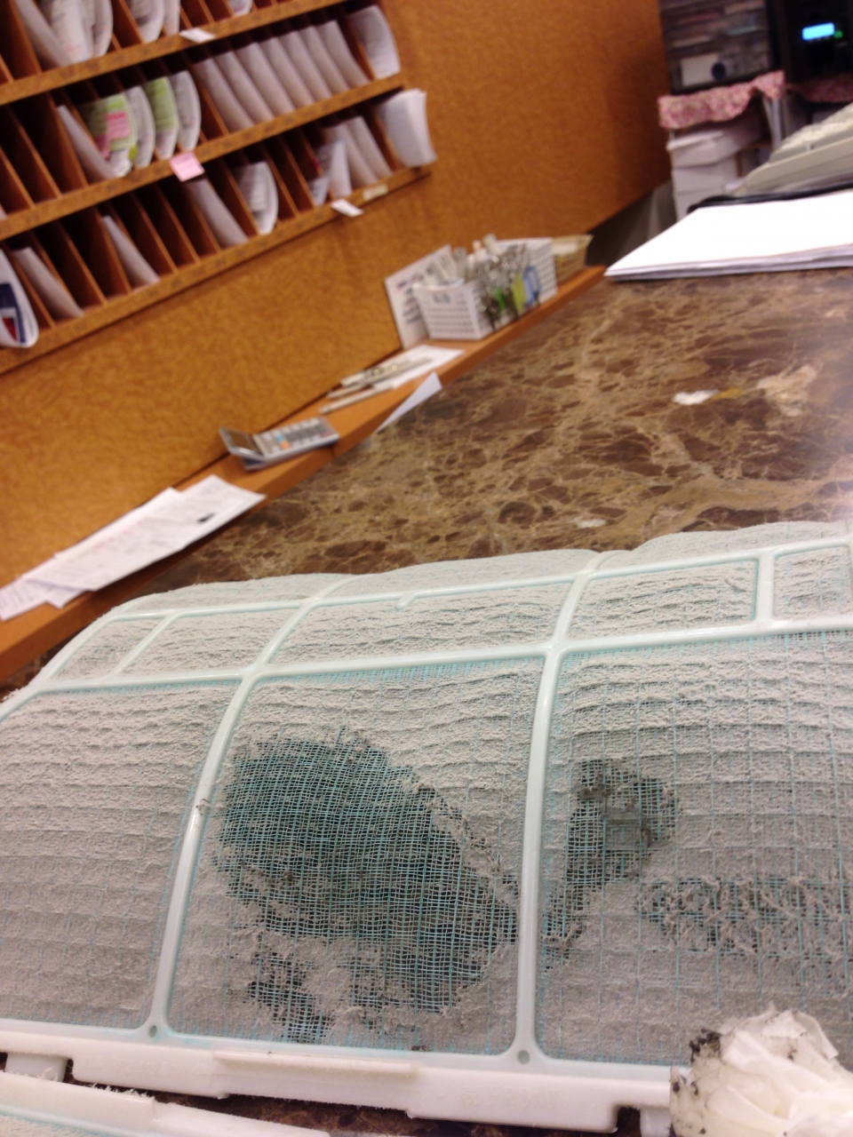 - 電球の上にホコリ。トイレに尿石のよごれ。エアフィルターがホコリで真っ白。咳が止まらなくなりました。