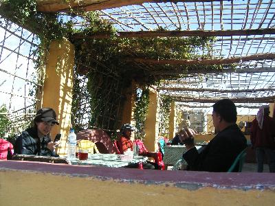 砂漠の中にある休憩所で。右側にいる大柄な人物は、ツアー・ポリス。銃を携...