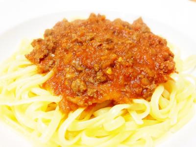 少々深さのある丸いお皿に、パスタそしてミートソース。パスタは綺麗な優しい色をしています。卵入りのタリアテッレ(フェットゥチーネ)でした。ん?どこかにspaghettiって文字を見たような気がするけれど…昔はスパゲッティだったのかなぁ。