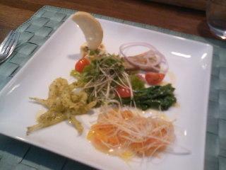 茨城県産の白魚のフリット・バジルソース、平目のカルパッチョ・はっさくと粒マスタードのソース、ドライフルーツとナッツ入りクリームチーズ、コッパ(豚肉の煮こごり)、菜の花のグリル。