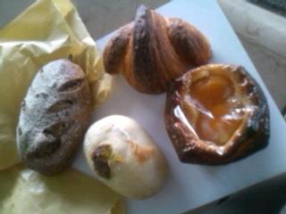 とっても小さいお店なのに、種類は割と豊富。左からいちじくとくるみパン、クロワッサン、アプリコットデニッシュ、おいもパン。