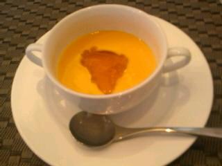 続いてスープ(写真)。これは美味しかったです。この日は人参のスープでしたが、真ん中にコンソメがあって面白い。人参の味がよく感じられてもう一杯食べたいくらい。