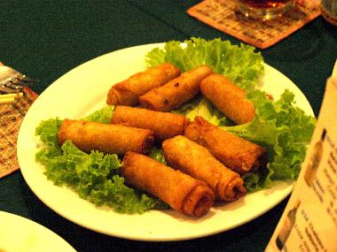 で魚のあんかけ、揚げたて春巻き。これは二口くらいで食べられちゃうサイズのもの。うまい!