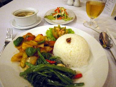 スープは辛くないトム・ヤム・クンみたいな味で、サラダは程よい甘酸っぱさで食べやすい。メインは白身魚(雷魚かな?)の揚げたものにピーマンやたまねぎ、ジャガイモなどが炒めてあります。それに空芯菜炒めとトマト。