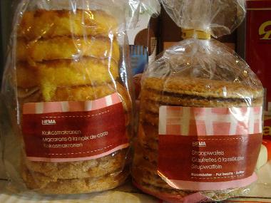「オランダの無印」とウワサのHEMAで買ったお菓子。右はオランダ人の大好きなストループワッフル。薄くて丸いワッフルにキャラメルが挟んであり、温かい飲み物の入ったカップに蓋のように乗せ、中のキャラメルがトロリとした所で頂くのが、オランダ人の好きな食べ方だそうです。