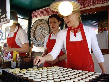 チーズを売っている隣の屋台に、写真のようなものを発見しました。ちょっと見、まるでたこ焼きを焼いているみたいですが直径5cmくらいのパンケーキのようなものです。何種類かトッピングが出来て、私は粉砂糖のみにしましたが見ていると大量のホイップクリームを選ぶ人が多かったです。