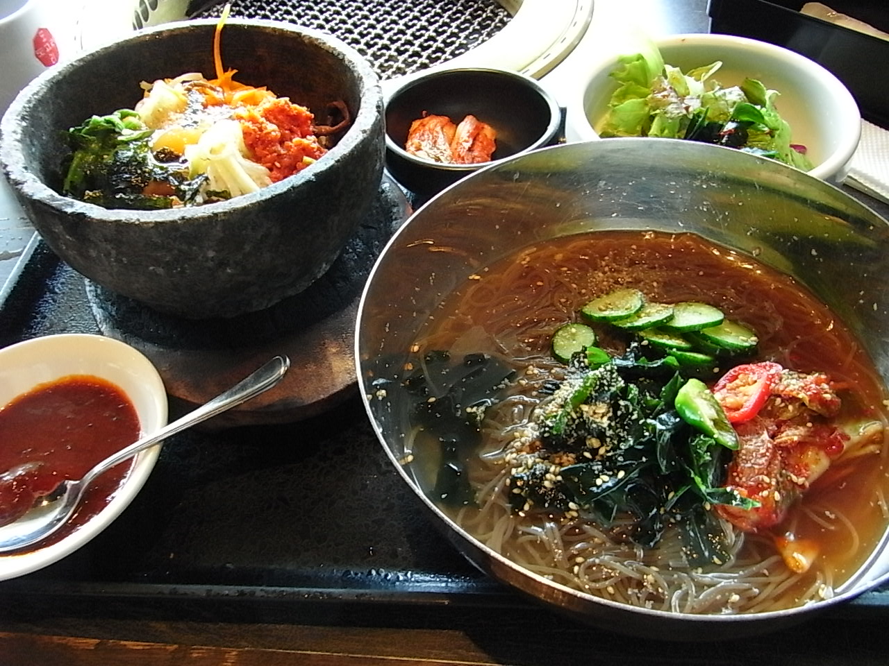 写真の、辛冷麺のセットを注文。好きな麺類とミニビビンバ(石焼は100円プラス)、チョレギサラダに白菜キムチ、アイスクリーム、ドリンクで1,680円。