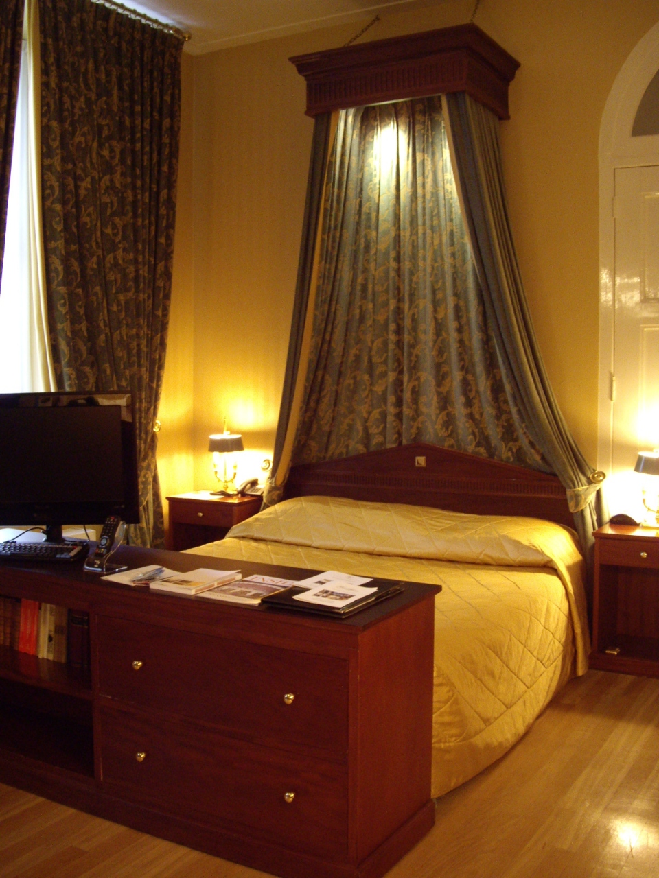 部屋は床にも木材が使われていて、とても温かく落ち着いた雰囲気。絵も沢山掛かっています。ティーバッグは数種類沢山。ベッドの上にはちょっと天蓋を思わせるようなカーテンがかかり、360度回転する液晶テレビはベッドからもテーブルからも良く見えます。テレビはネット使用可(日本語対応ではないようでしたが)。本も何冊も置いてあります。