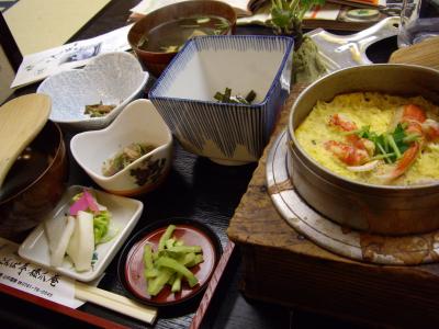 釜飯は全て山菜懐石つきで、釜飯をはじめ一品一品山葵をつけて食べます。山葵って、色々なものに合うんだなぁと目からウロコ。