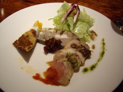 デザートみたいに軽くて、甘く溶ける感じのフォアグラのムースに始まり、ホタテときのこのテリーヌ、ムール貝のグラタン、人参・カニ・カリフラワーの前菜、それから豚足、自家製生ハム、ポークの詰め物、ガレット、 メインは、マダイ、ソイ、アマダイ。どの魚も、ふんわりとその新鮮さが分かる日の入れ具合で一切れ一切れが、美味しかったです。